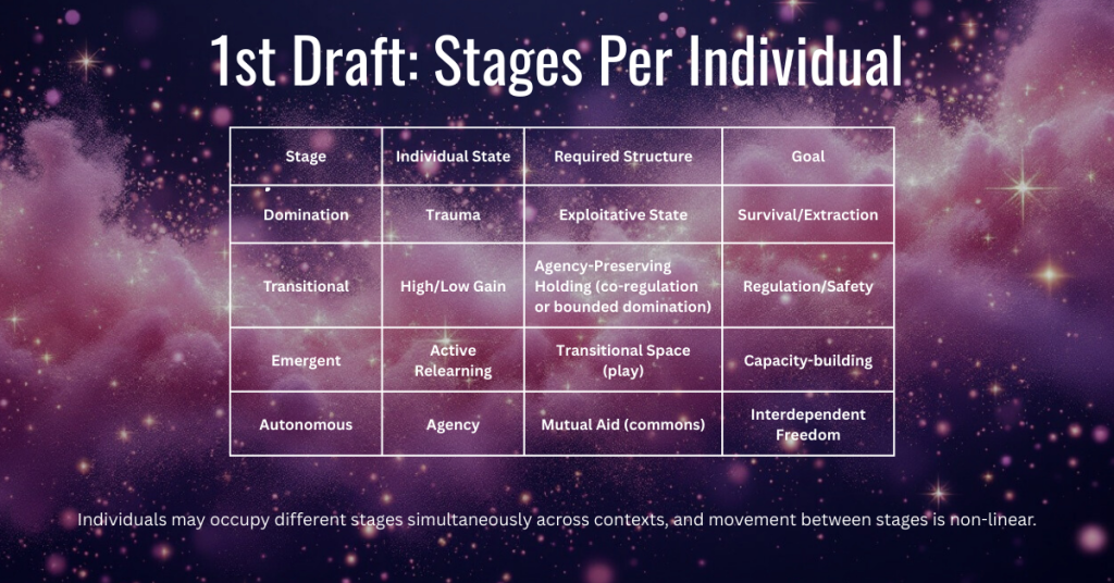 Relational trauma also requires relational repair. While we can work to increase safety with environmental cues, the question of how to achieve agency-preserving dominance without becoming dominating — and without bureaucratic sprawl — remains a question to me.